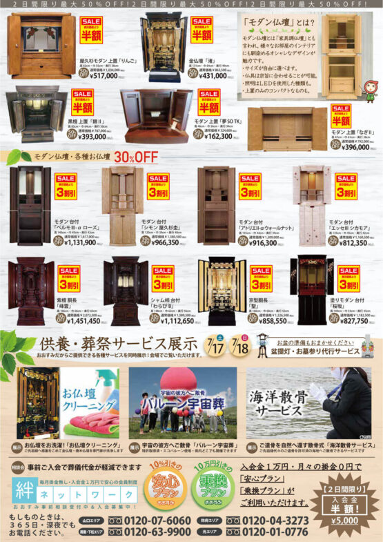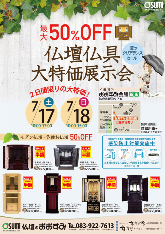 仏壇のおおすみは、仏壇仏具大特価展示会を2021年7月17日(土)、7月18(日)に防府市のおおすみ会館新田にて開催いたします。モダン仏壇、金仏壇、唐木仏壇などのお仏壇を通常価格より50%~30%割引でご奉仕させていただきます。会場は大型駐車場をご用意して、新型コロナ感染防止対策に配慮して開催いたします。