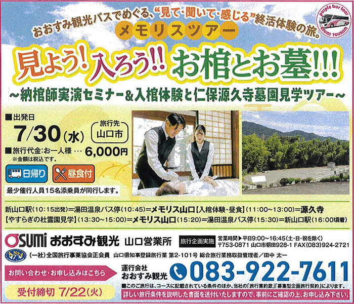 今回募集のツアーは、おおすみ会館の納棺師が実演形式でセミナーを行うほか、入棺体験もご用意しています。昼食もご用意しております。午後は、山口市仁保の「源久寺」の霊園「やすらぎの杜」に行き、自然墓(樹木葬)・永代管理墓・永代使用合祀墓・ペット供養墓など現代のお墓を見学いただけます。